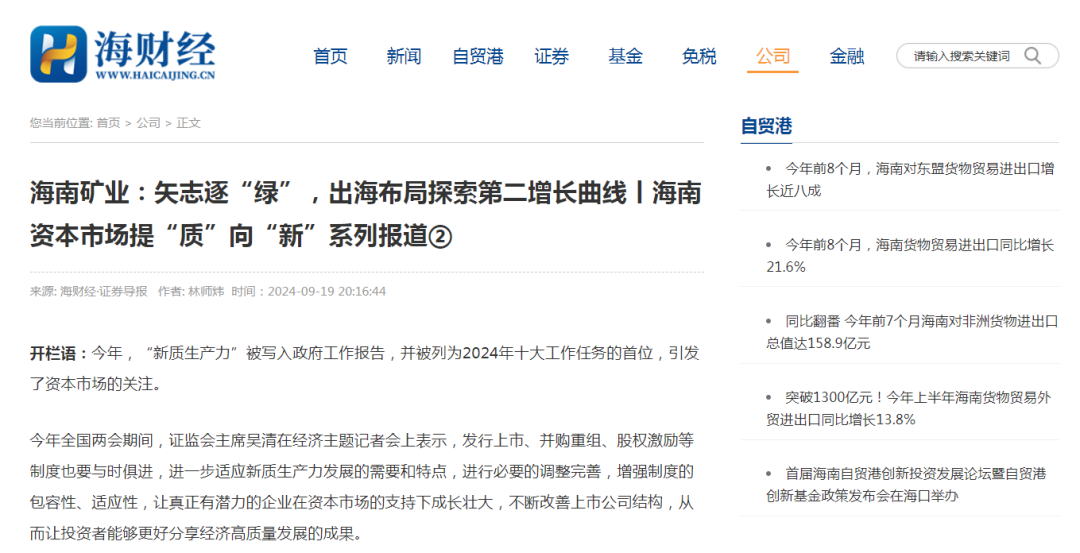 9月19日,證券導(dǎo)報發(fā)布題為《海南礦業(yè):矢志逐“綠”,出海布局探索第二增長曲線》專題報道。