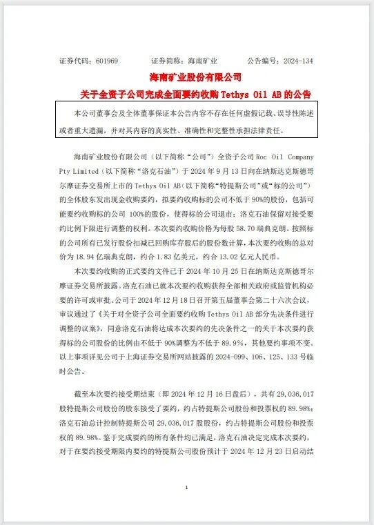 12月18日,海南礦業(yè)發(fā)布公告,全資子公司洛克石油要約收購(gòu)Tethys Oil AB(下稱“特提斯公司”)項(xiàng)目取得重大進(jìn)展: