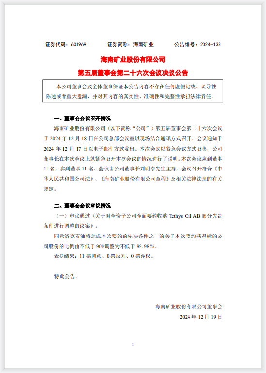 海南礦業(yè)于2024年12月18日召開第五屆董事會(huì)第二十六次會(huì)議,同意洛克石油對(duì)接受要約比例的下限進(jìn)行調(diào)整,從不低于90%調(diào)整為不低于89.9%,其他要約事項(xiàng)不變。